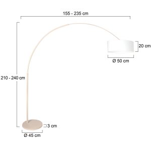 Die Höhe der Lampe ist von 210 bis 240 cm verstellbar und die Fußplatte von 45 cm sorgt für ausgezeichnete Stabilität. Mit einem 250 cm langen Kabel und einem praktischen Fußschalter ist diese Lampe zudem einfach zu bedienen. Der Leinen-Schirm hat einen Durchmesser von 50 cm und ist 20 cm hoch – perfekt für eine gemütliche Atmosphäre über der Couch oder in einer Leseecke.