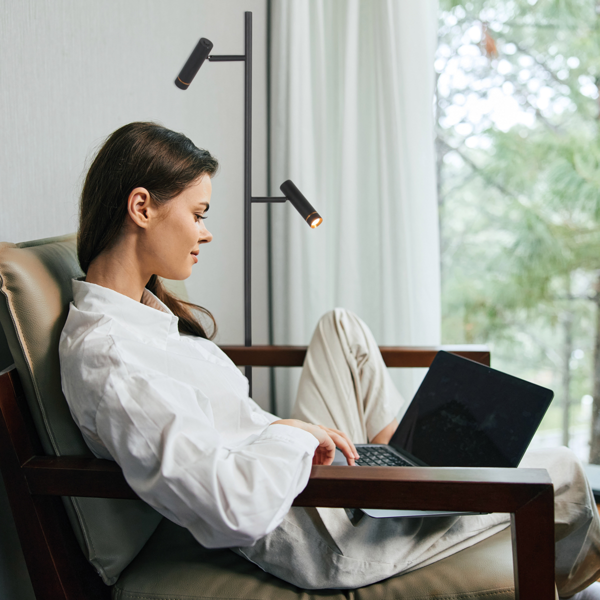 Die Lumo 4608ZW ist eine moderne Stehlampe mit zwei Lichtpunkten und einem eleganten, vollständig schwarzen Design. Die schlanke Form und der zeitlose Stil machen diese Lampe ideal für moderne, industrielle und minimalistische Interieurs.