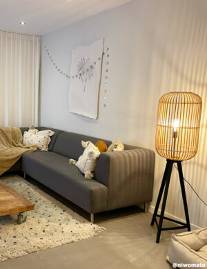 Die Stehlampe hat einen schwarzen Metallfuß auf einem Dreibein und besitzt einem Lampenschirm aus naturfarbenem Bambusholz. Der Lampenschirm erzeugt ein faszinierendes Licht- und Schattenspiel, sobald er von Ihnen eingeschaltet wird. Die Stehleuchte passt nahtlos in die Trends der Natur hinein und garantiert durch die natürlichen Anwendungen der Materialien bei der Anfertigung eine angenehme Atmosphäre. Dieses Lampenmodell bietet eine beruhigende Beleuchtung für alle Räume, einschließlich Wohn-, Schlaf- und Esszimmer sowie im Flur. Diese Lampe ist für Leuchten auf E27-Basis geeignet.