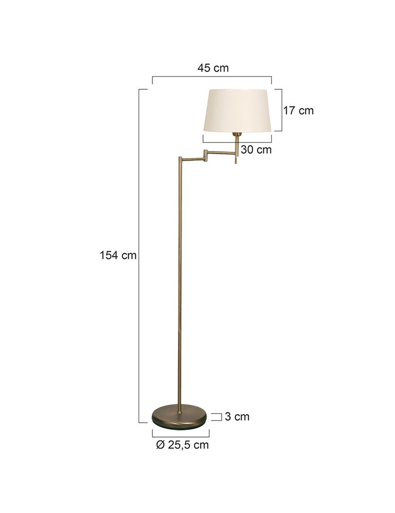 Diese bronzefarbene Stehlampe aus der Bella-Serie von Mexlite kombiniert Eleganz mit Funktionalität. Dank des cremefarbenen Leinen-Schirms und des verstellbaren schwenkbaren Arms leuchtet das Licht immer genau dort, wo du es brauchst. Die Lampe hat eine E27-Fassung und ist für Leuchtmittel bis 40 Watt geeignet. Mit einem Zugschalter lässt sich die Lampe einfach ein- oder ausschalten. Die Gesamthöhe beträgt 154 cm, mit einer Reichweite von 45 cm und einem Schirmdurchmesser von 30 cm. Diese stilvolle Stehlampe macht sich hervorragend im Esszimmer, Wohnzimmer oder in einem (Heim)büro. Die Lampe wird mit einem 180 cm langen Kabel geliefert.