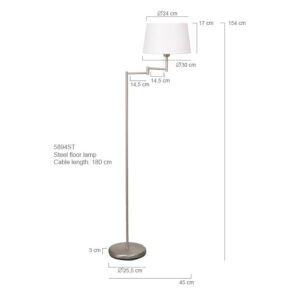 Diese stahlfarbene Stehlampe aus der Bella-Serie von Mexlite kombiniert ein modernes Erscheinungsbild mit praktischer Beleuchtung. Die Lampe besteht aus gebürstetem Stahl und ist mit einem weißen Leinen-Schirm ausgestattet, was für einen zeitlosen Look sorgt. Dank des schwenkbaren Arms lässt sich das Licht einfach dorthin richten, wo es benötigt wird, perfekt zum Lesen oder für stimmungsvolle Beleuchtung. Die Lampe hat eine E27-Fassung und ist geeignet für Lichtquellen von bis zu 40 Watt. Mit einer Höhe von 154 cm, einer Reichweite von 45 cm und einem Schirmdurchmesser von 30 cm ist dies eine vielseitige Ergänzung für das Esszimmer, das Wohnzimmer oder ein (Heim)Büro. Der Zugschalter macht die Bedienung einfach, und die Lampe wird mit einem 180 cm langen Kabel geliefert.