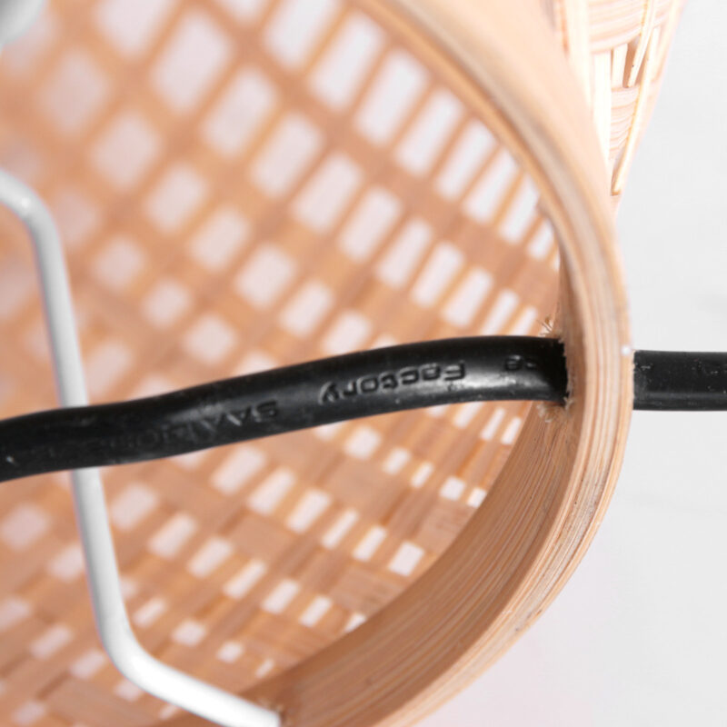 Stimmungsvolle Beleuchtung für den Tisch oder auf einem niedrigen Schrank erhältst du mit der Bambustischlampe. Die Lichtquelle ist an der Unterseite der Lampe befestigt. Dadurch entsteht, auch wenn die Lampe auf einem niedrigen Tisch steht, ein besonderes Lichteffekt. Dies wird noch durch die Maschen im Geflecht unterstrichen. Diese Lampe passt gut in ein retro oder natürliches Interieur.