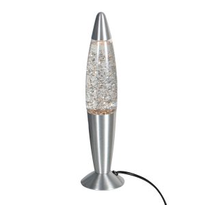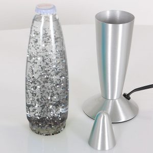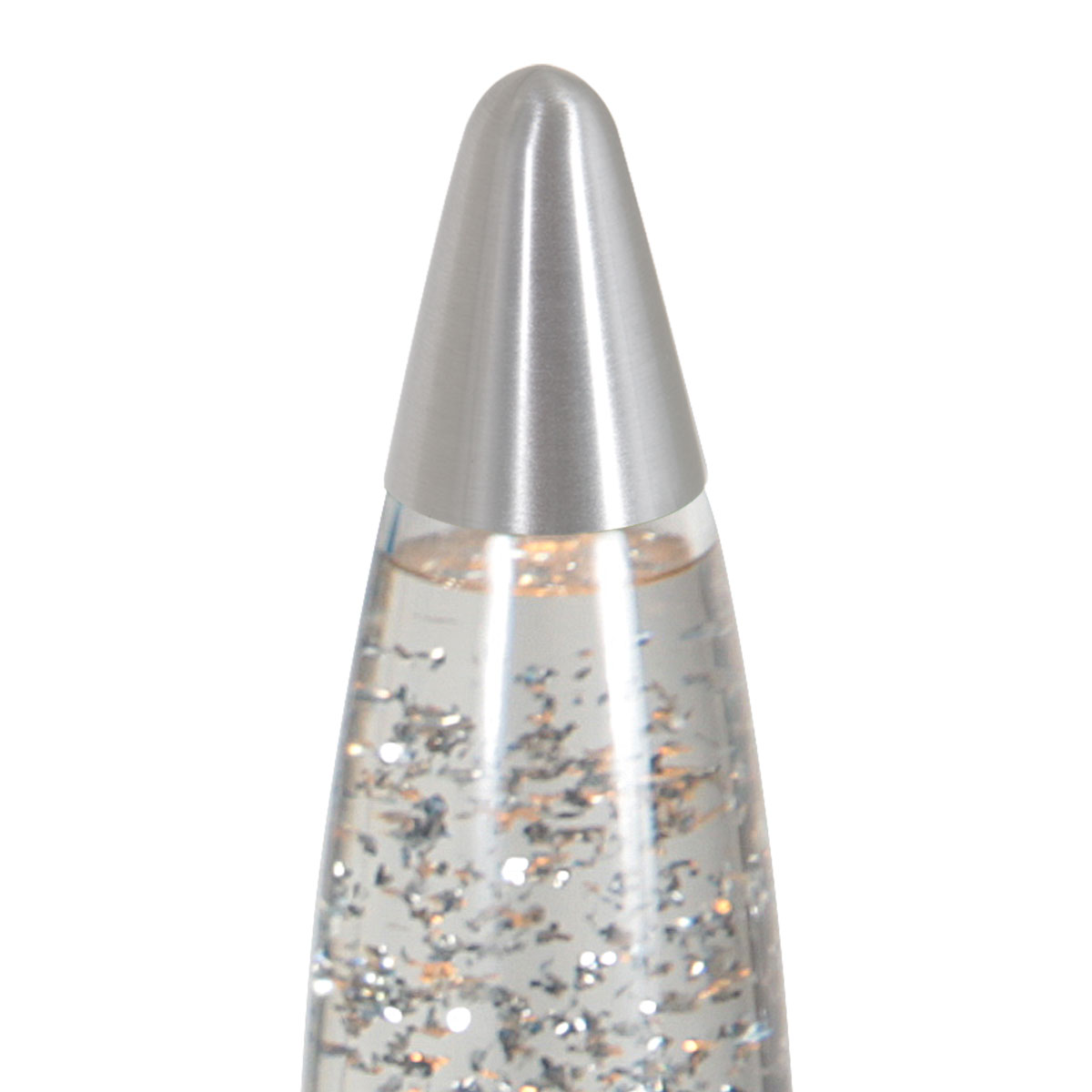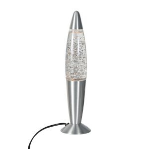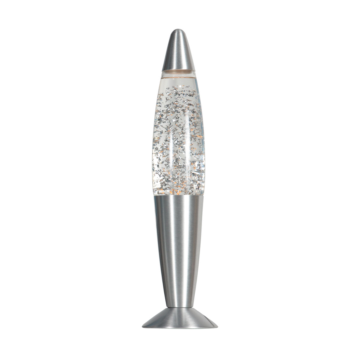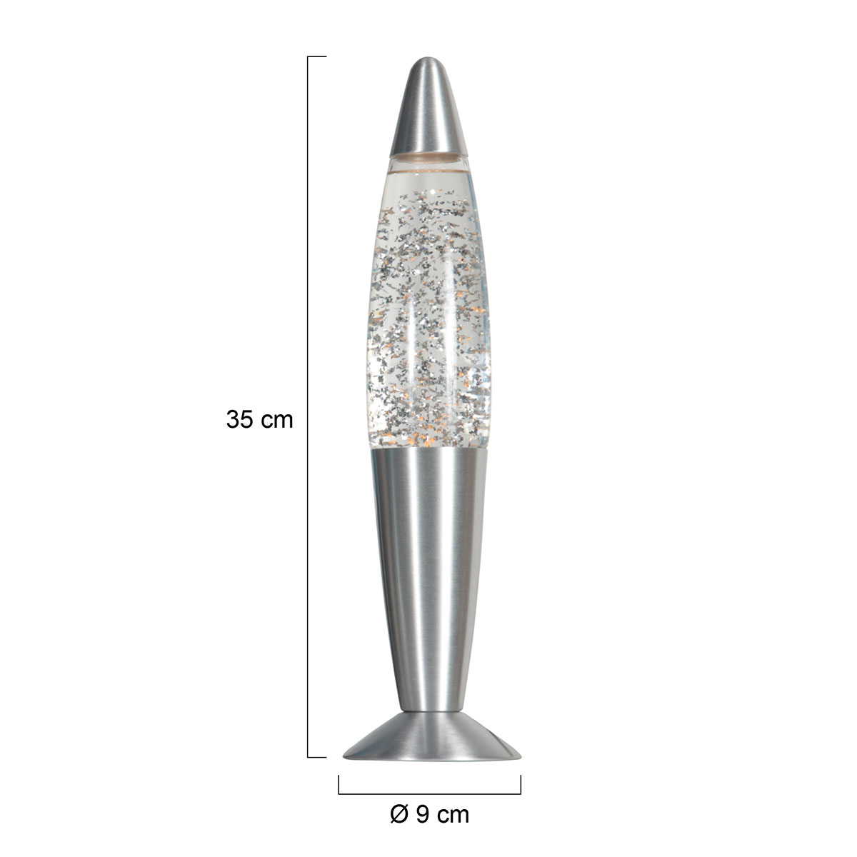 Die Volcan Glitter-Tischlampe von Mexlite bringt eine verspielte und magische Atmosphäre ins Zuhause. Diese Retro-Lavalampe hat eine einzigartige stählerne Raketengestalt und eine transparente Flasche, in der Glitzer durch die Wärme der Lichtquelle bewegt wird. Dies sorgt für einen beruhigenden und hypnotisierenden Effekt. Mit einer kompakten Höhe von 35 cm und einem Durchmesser von 9 cm passt die Lampe perfekt auf einen Nachttisch, Schreibtisch oder eine Kommode.