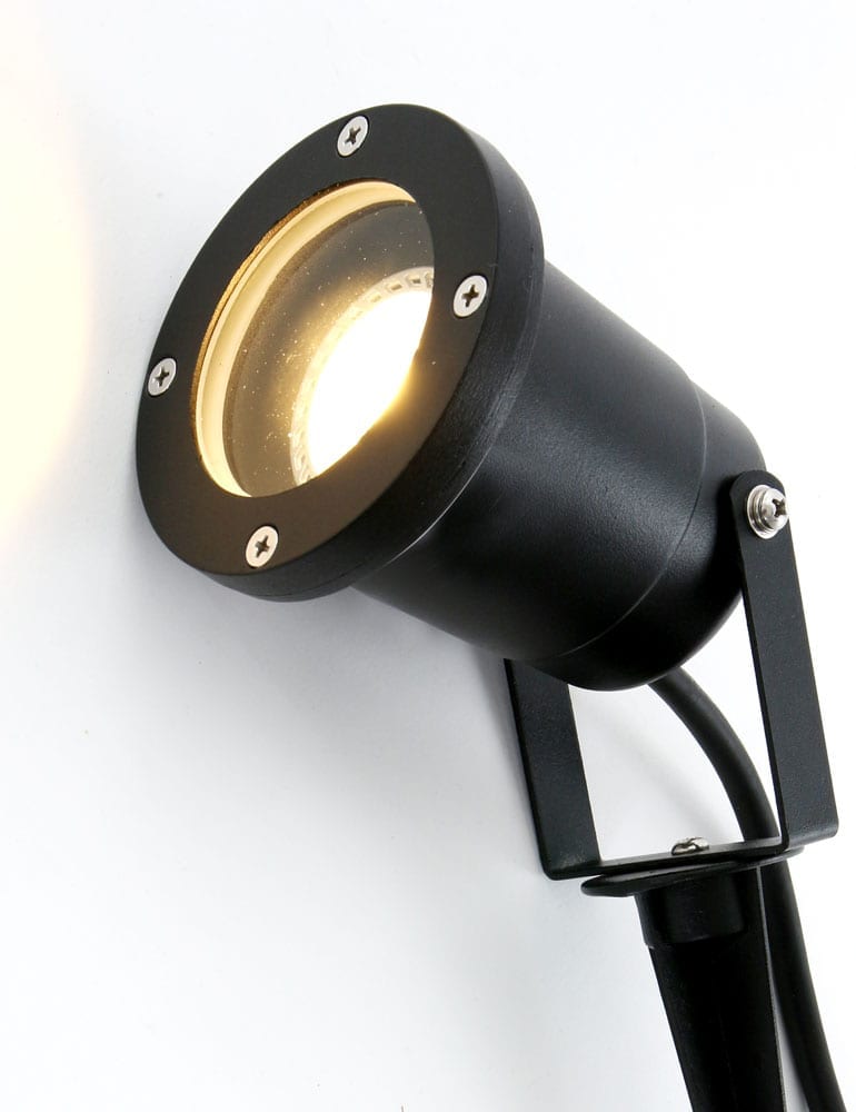 Die schwarze Außenlampe oder Erdspot Nova wird mit einem Erdspieß geliefert und hat eine Höhe von 32,5 cm. Der Spot selbst ist 9,5 cm lang und 9 cm breit. Diese Lampe wird inklusive GU10 LED-Leuchtmittel geliefert (2700 Kelvin, 345 Lumen) und hat ein Kabel von 155 cm mit Stecker. Dank des IP54-Wertes ist die Lampe spritzwassergeschützt und staubdicht, ideal für den Außenbereich.