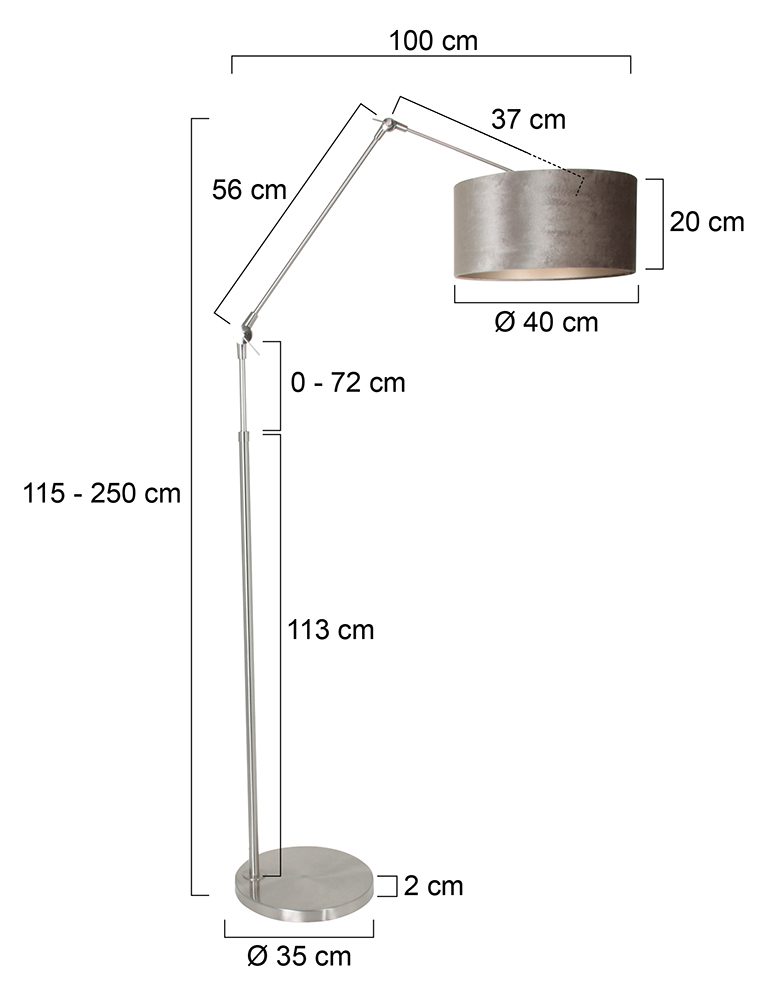 Mit ihrem luxuriösen Erscheinungsbild und dem clever verstellbaren Arm bietet diese Stehleuchte die ideale Balance zwischen Stil und Funktionalität. Der sanfte silberne Samt sorgt für einen eleganten Akzent in deinem Interieur, während der Gelenkarm es ermöglicht, das Licht genau nach Wunsch zu richten. Perfekt, um eine gemütliche Atmosphäre zu schaffen oder funktionales Licht dort zu haben, wo es benötigt wird.