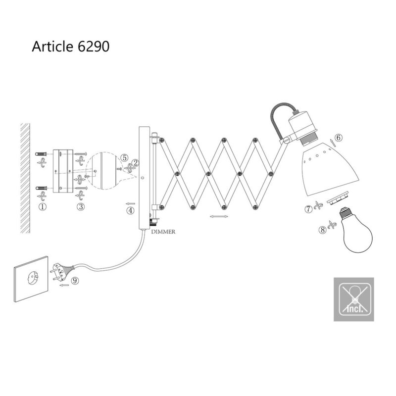 Die Lampe eignet sich hervorragend als Leselampe. Die Lampe verfügt über einen Scherenmechanismus, der eine optimale Verstellbarkeit ermöglicht. Durch ihre Stahlfarbe passt die Lampe gut in eine moderne Einrichtung. Der Spot ist mit einer normalen E27-Fassung ausgestattet. Der Drehdimmer befindet sich auf der Wandplatte. Der Anschluss ist sehr einfach. Diese Scherenlampe ist nämlich mit einem langen Kabel und Stecker ausgestattet.