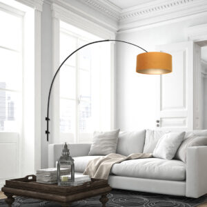 Eine Kombination aus robust und stimmungsvoll. Der ockerfarbene Samtschirm fügt dem Interieur einen warmen Glanz hinzu, während das schwarze Gestell einen industriellen Touch verleiht. Dank des großzügigen Bogens strahlt das Licht genau an die richtige Stelle, ideal für eine gemütliche Leseecke oder ein stilvolles Wohnzimmer.