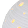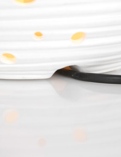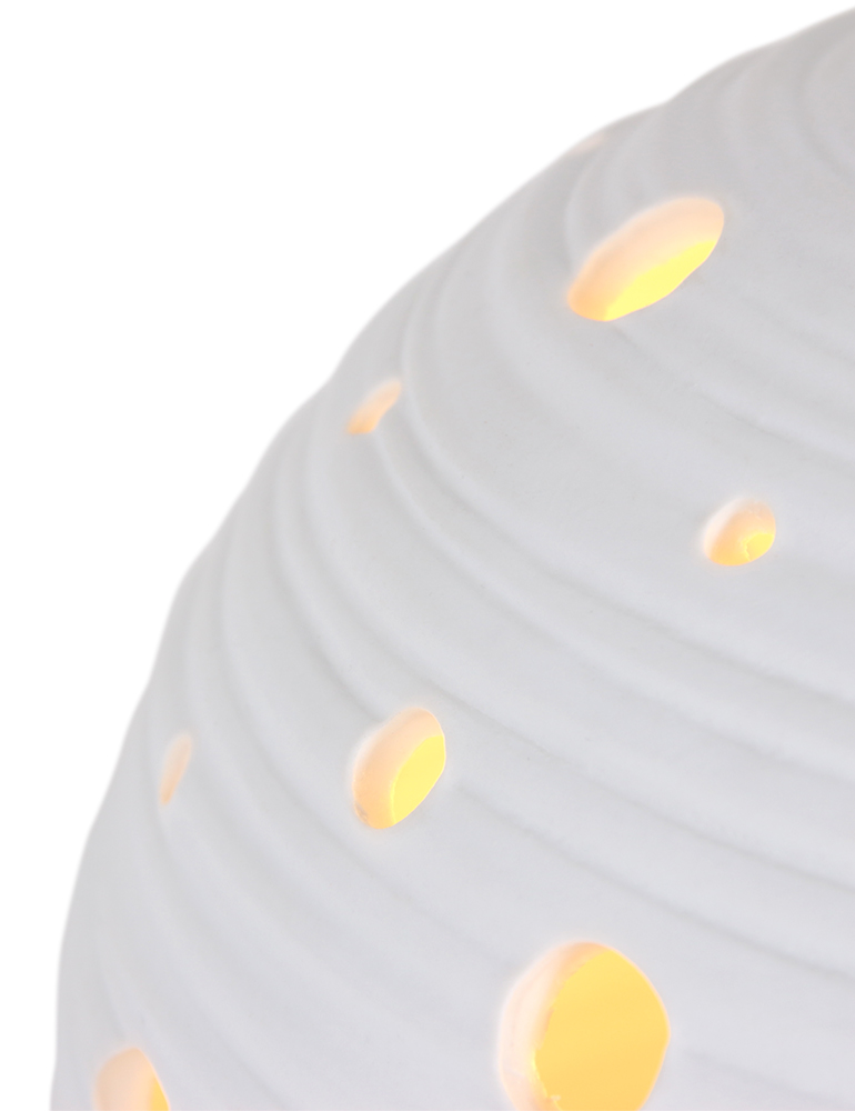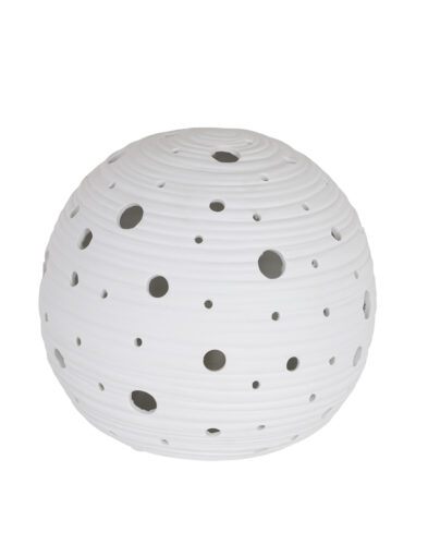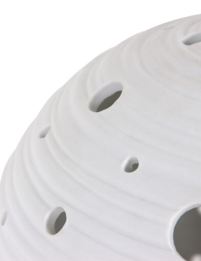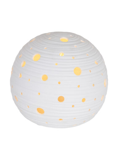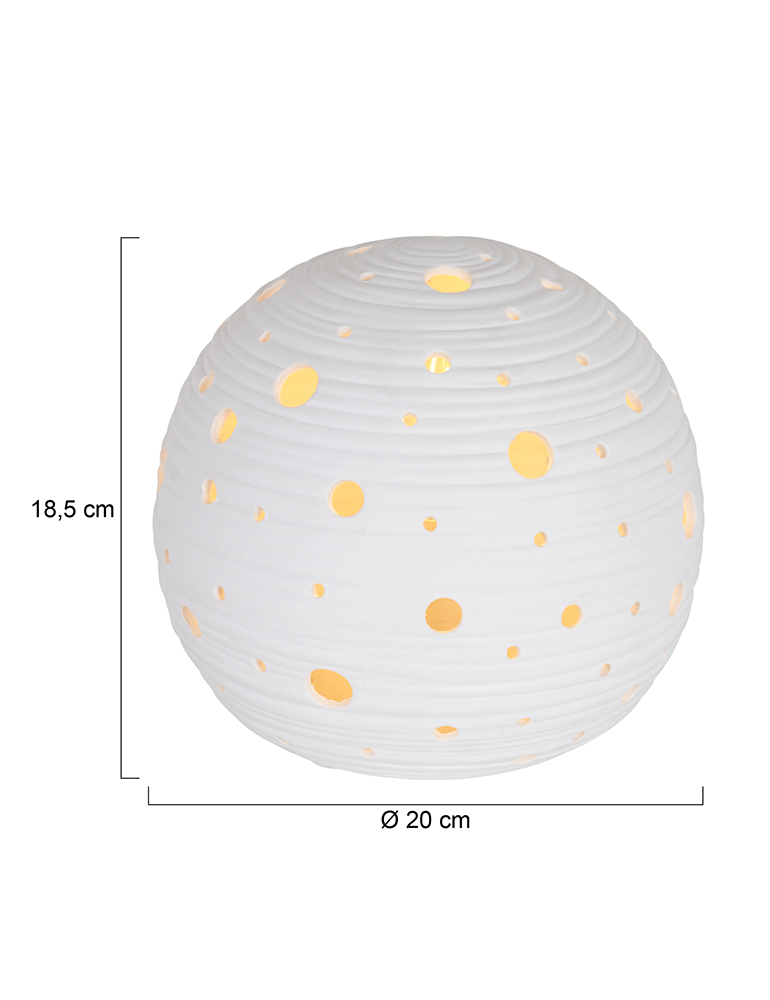 Die Jazz Tischlampe in Mondform ist eine verspielte Ergänzung für jedes Interieur. Hergestellt aus Keramik mit einem perforierten Design, durch das das Licht stimmungsvoll durch die Löcher strahlt. Ausgestattet mit einer E14-Fassung und einem Ein/Aus-Schalter im Kabel. Mit einer Höhe von 18,5 cm und einem Durchmesser von 20 cm ist dies eine ideale Lampe für einen Nachttisch oder das Kinderzimmer.